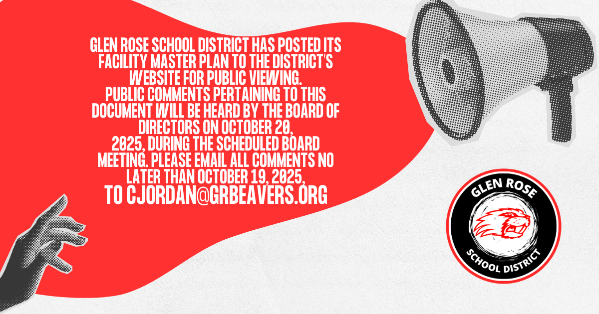 Public Notice: Facility Master Plan Available for Review Glen Rose School District has posted its Facility Master Plan on the district website for public viewing. The Board of Directors will hea. . .