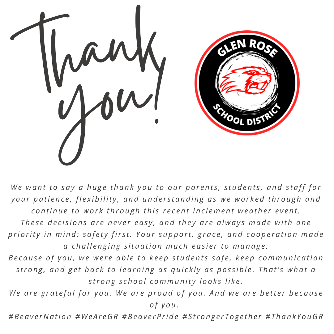 Glen Rose School District will be closed on Thursday, January 29, 2026 due to unsafe road conditions.