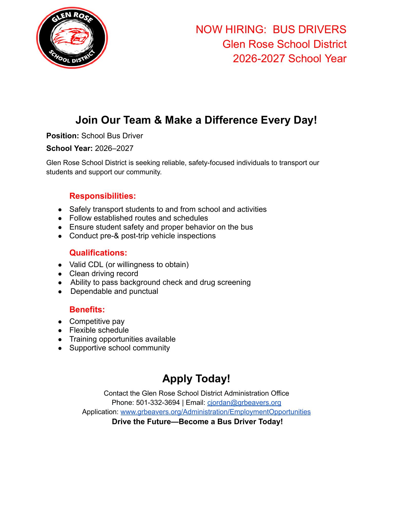Good Afternoon Glen Rose Parents and Students,Glen Rose School District will run normal bus routes this afternoon, February 5th. If there is a road with ice still on it, please meet the bus at the ...